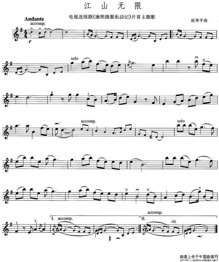 江山无限胡琴乐谱:江山无限胡琴乐谱该歌谱演奏者为赵季平,歌曲名称为江山无限,歌谱类型为。《江山无限》是屠洪刚演唱的歌曲,由邹静之作词,赵季平作曲,歌曲发行于1999年1月1日,收录于专辑《精忠报国》。[1] 该歌曲是电视剧《康熙微服私访记4》的主题曲。