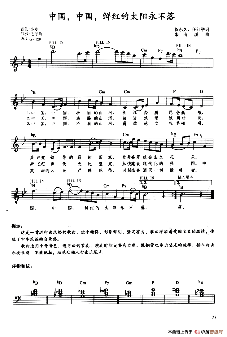 中国,中国,鲜红的太阳永不落(带歌词提示版)电子琴谱,简谱"
