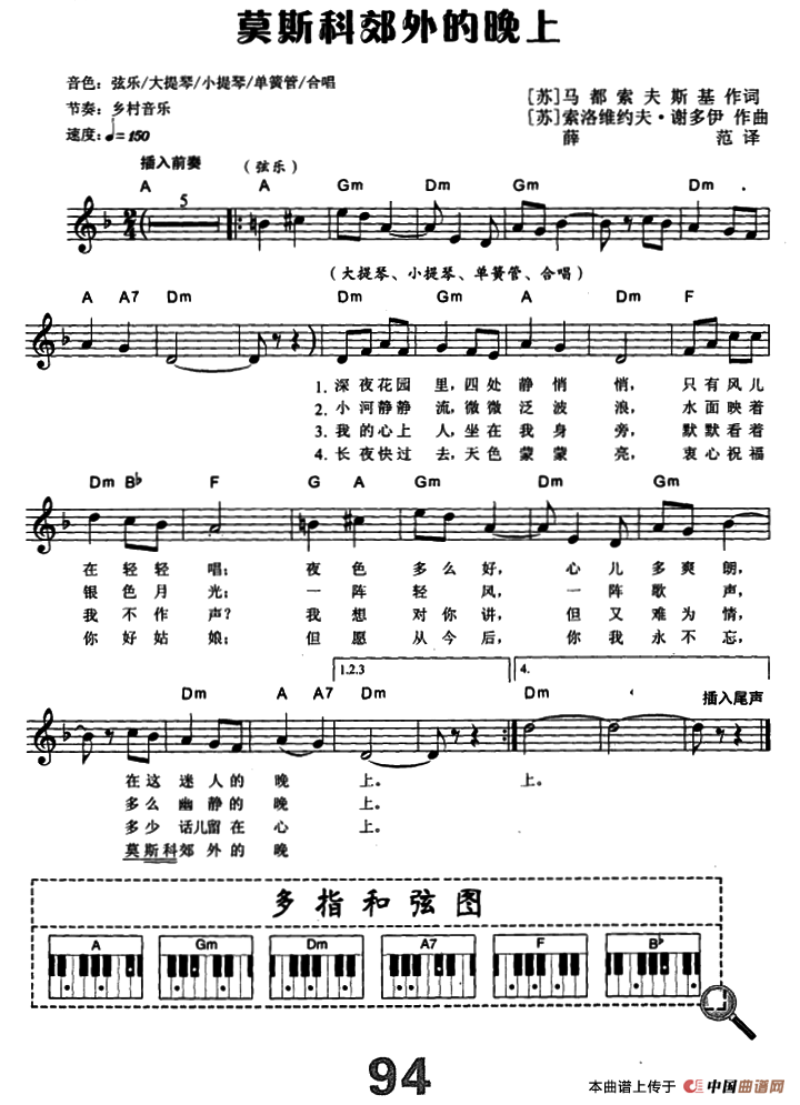 [前苏联]莫斯科郊外的晚上(电子琴弹唱谱)电子琴谱,简谱"