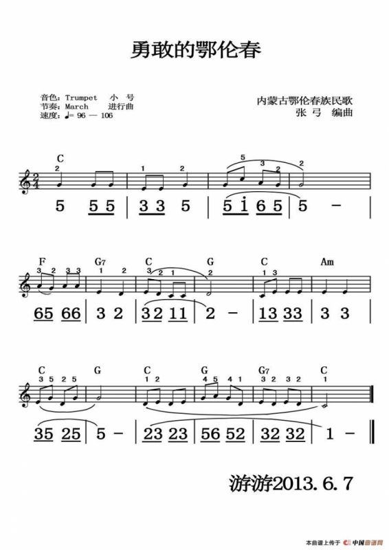 勇敢的鄂伦春电子琴谱(线简谱混排、游游制谱版),勇敢的鄂伦春简谱"