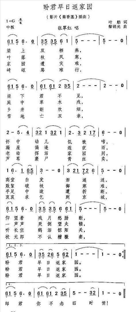 盼君早日返家园简谱,盼君早日返家园歌曲简介