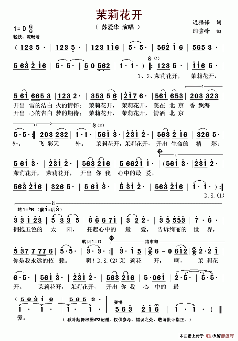 茉莉花开简谱,茉莉花开歌曲简介