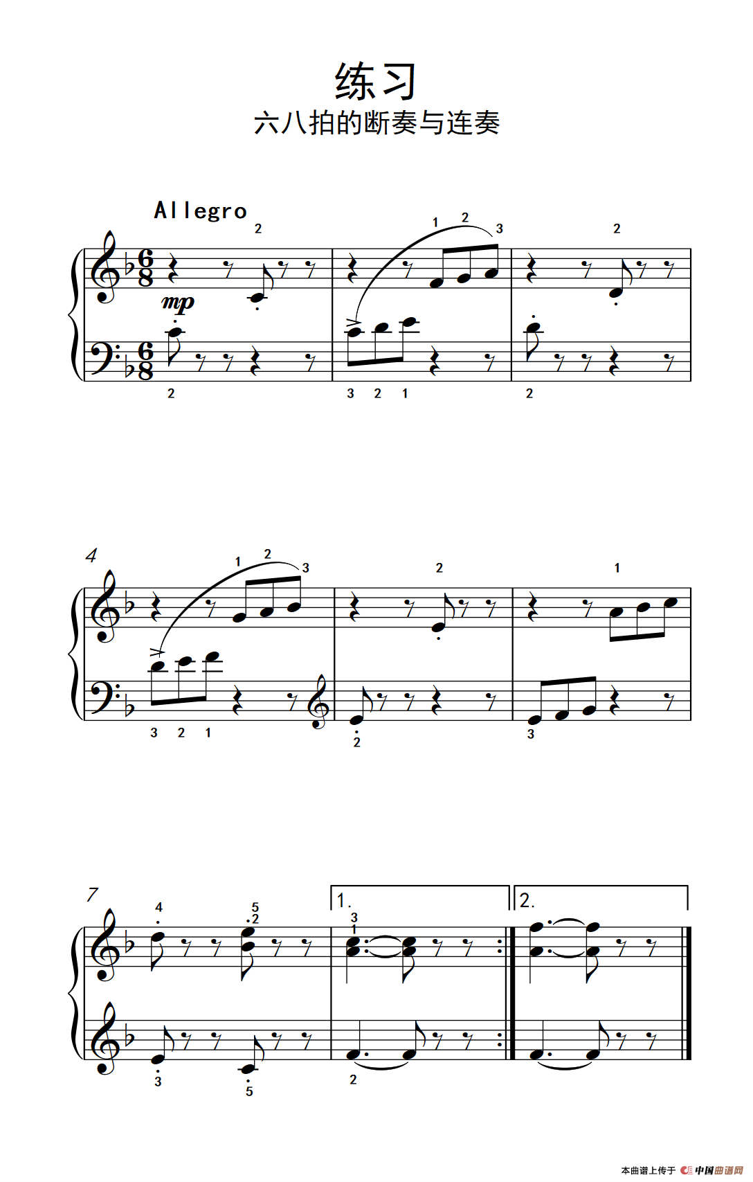 练习 六八拍的断奏与连奏(约翰·汤普森 成人钢琴教程 第一册)钢琴谱,简谱"