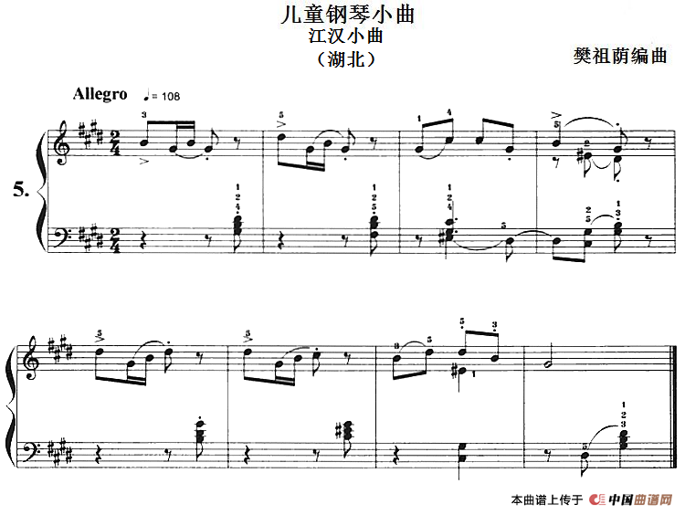 儿童钢琴小曲:江汉小曲(湖北)钢琴谱,简谱"