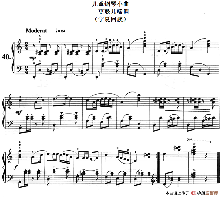 儿童钢琴小曲:一更鼓儿啼调(宁夏回族)钢琴谱,简谱"