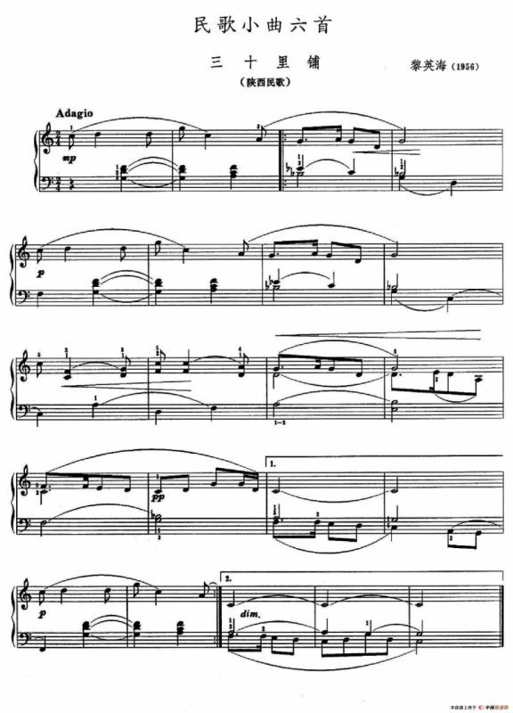 民歌小曲六首:三十里铺(陕西民歌)钢琴谱,简谱"