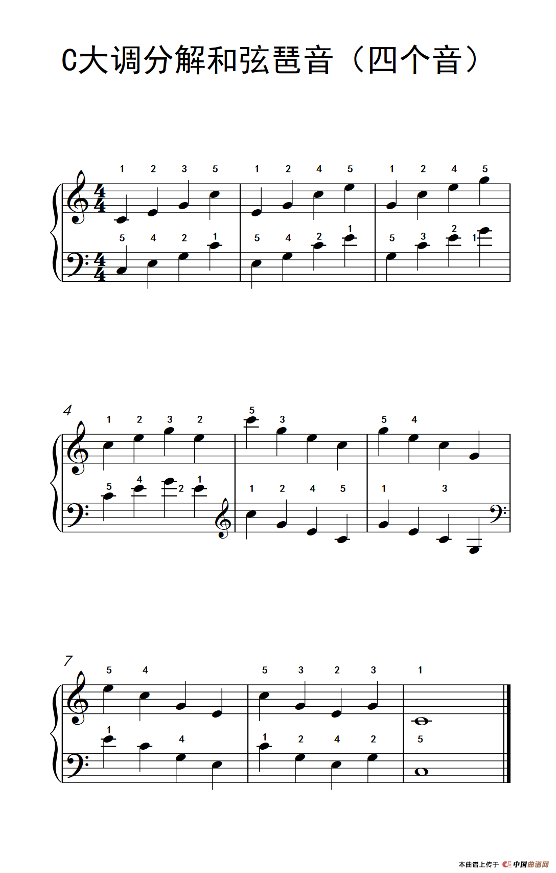 C大调分解和弦琶音(四个音)(儿童钢琴练习曲)钢琴谱,简谱"