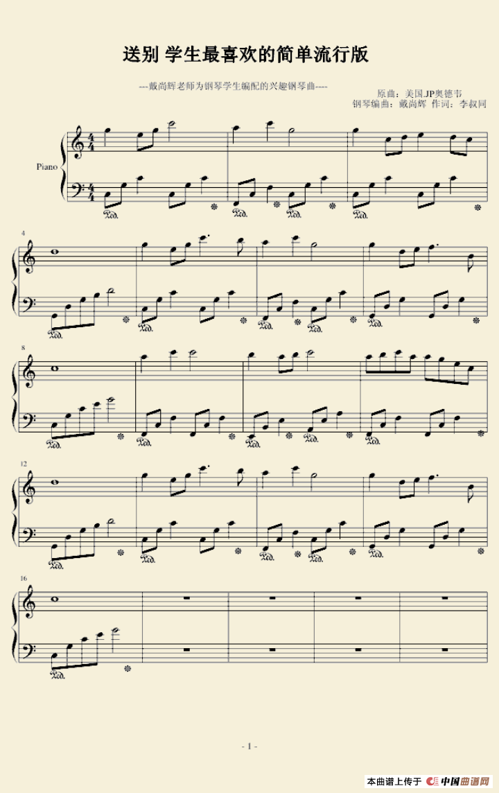 送别钢琴谱(超简钢琴曲、姚琳编配版),送别简谱"