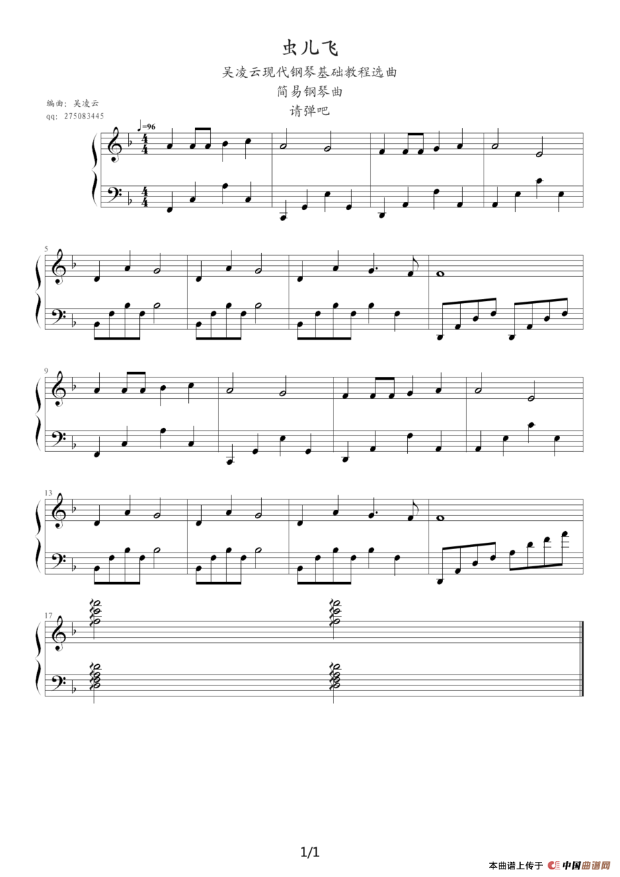 虫儿飞 钢琴谱(吴凌云编曲、简易版),虫儿飞简谱"