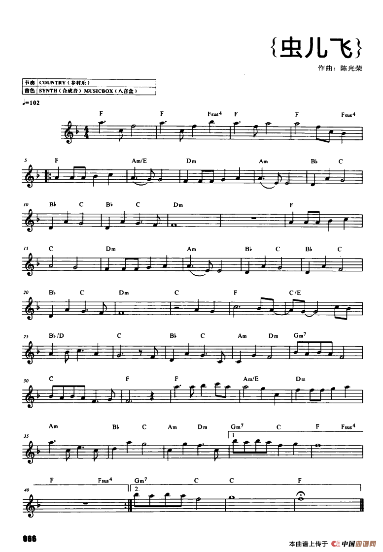 虫儿飞电子琴谱(盖世飞编配版),虫儿飞简谱"