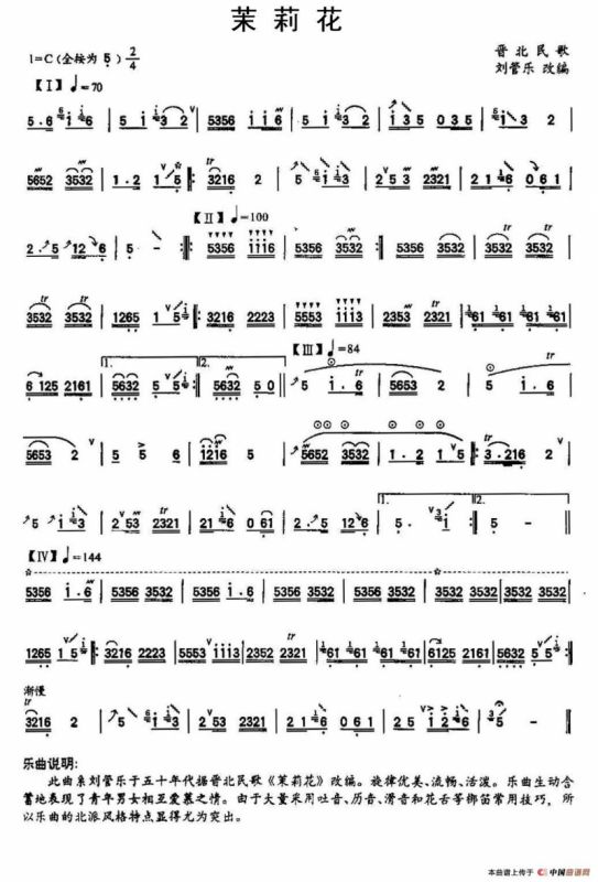 茉莉花笛箫谱(晋北民歌、刘管乐改编版),茉莉花简谱"