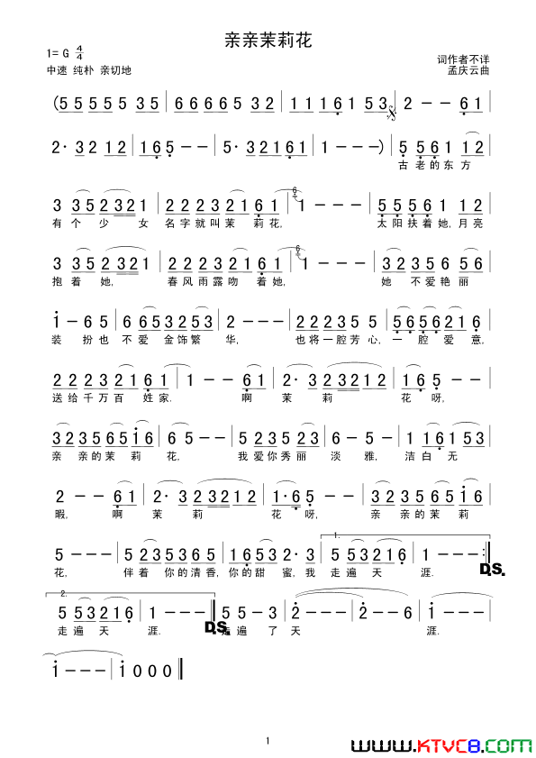 亲亲的茉莉花简谱,演唱李丹阳,歌词"