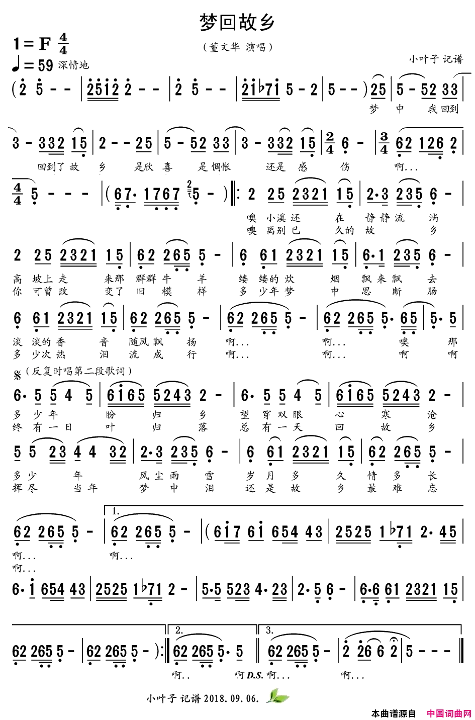 梦回故乡简谱,演唱董文华,歌词