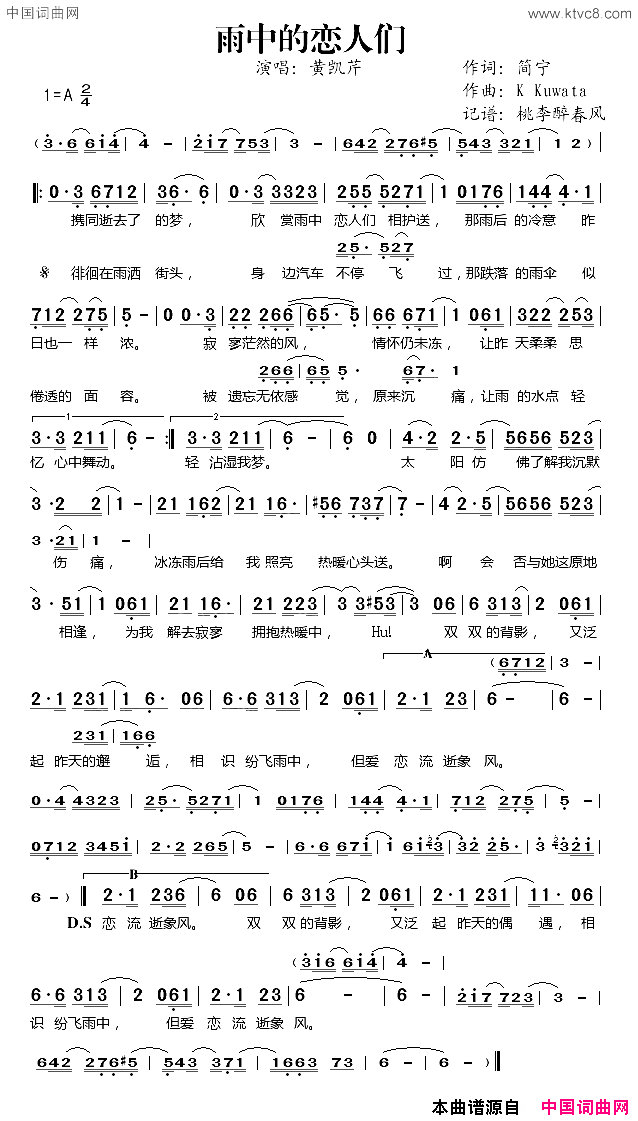 雨中的恋人们简谱,演唱黄凯芹,歌词