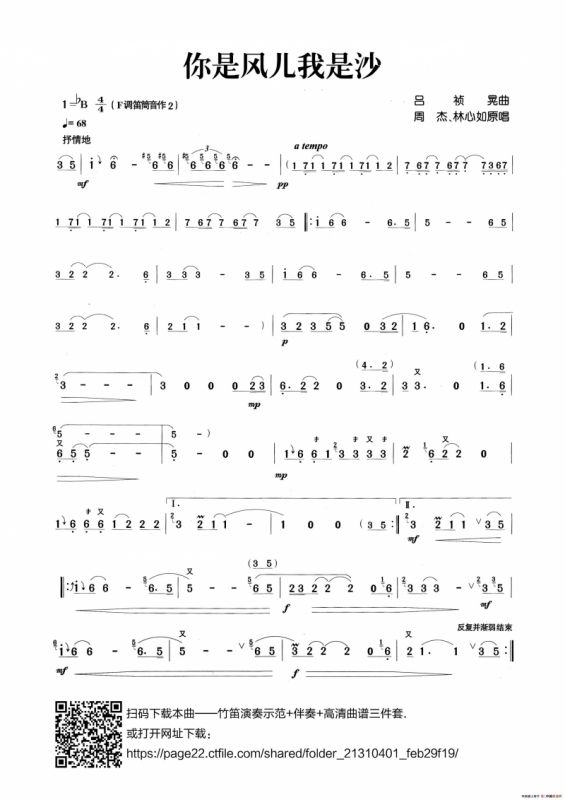 你是风儿我是沙笛箫谱(张宏笛子制谱版),你是风儿我是沙简谱"