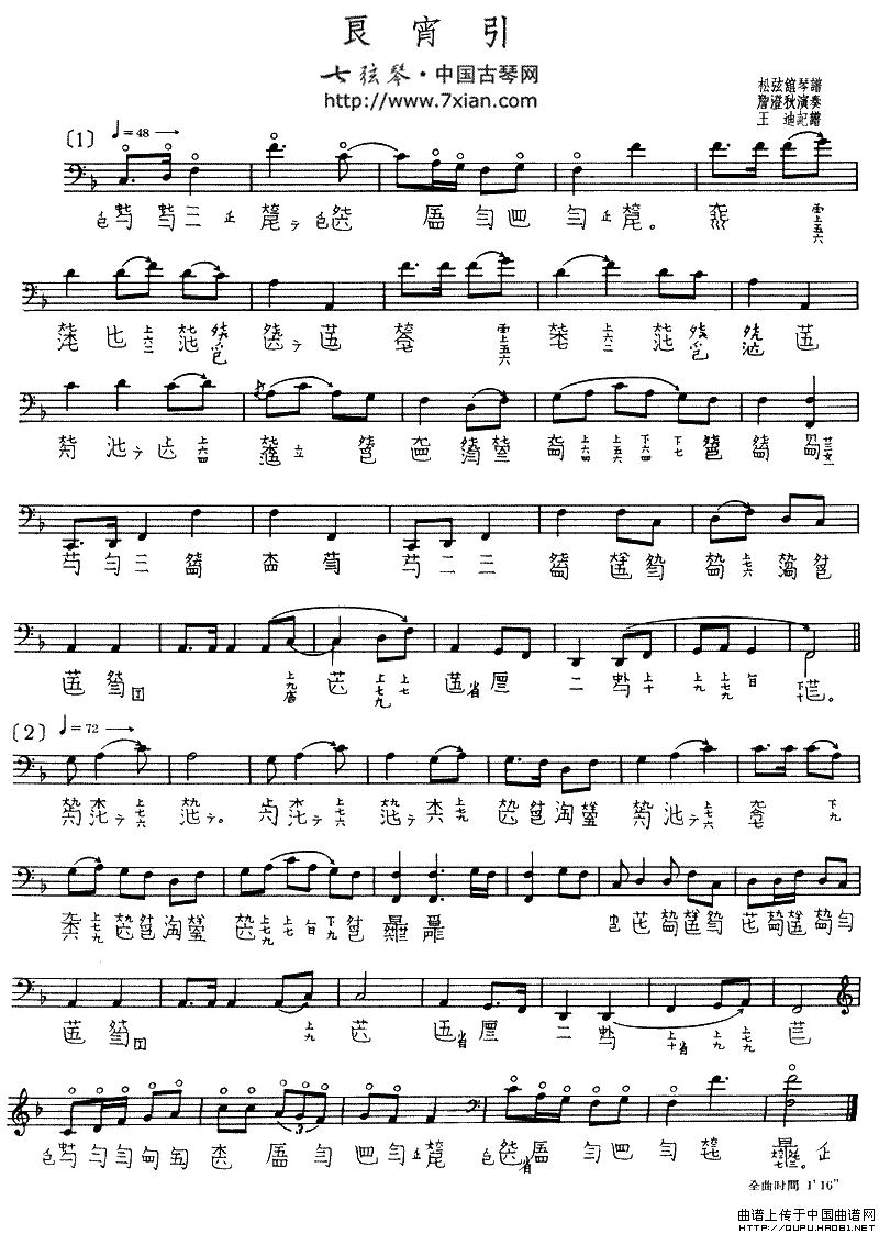 良宵引古筝谱/古琴谱(古琴谱、王迪记谱版),良宵引简谱"