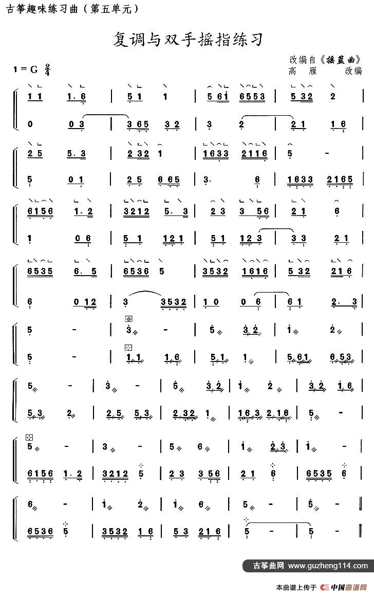 古筝练习:复调与双手摇指练习(改编自《摇篮曲》)古筝谱/古琴谱,简谱"