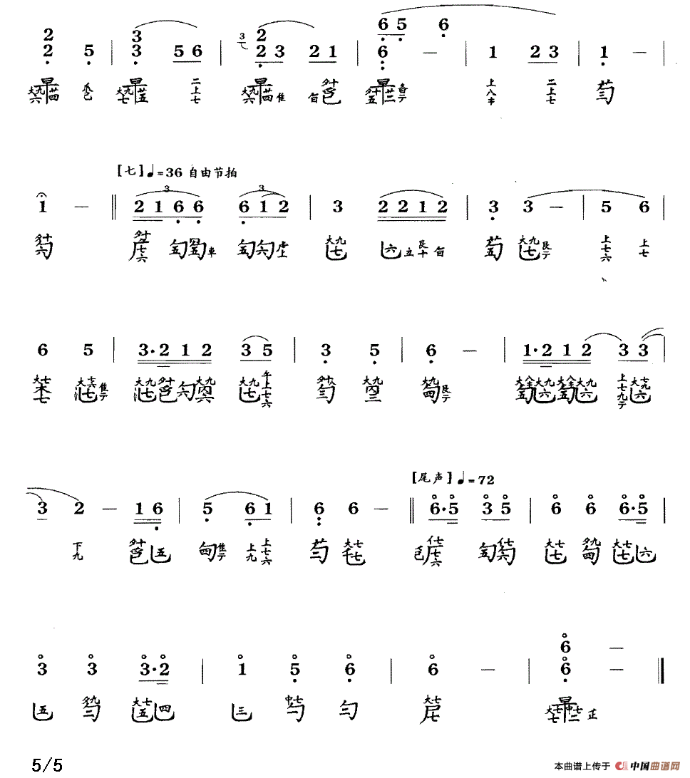 渔歌(吴景略演奏版、古琴谱 F调 简谱+减字谱)古筝谱/古琴谱,简谱"