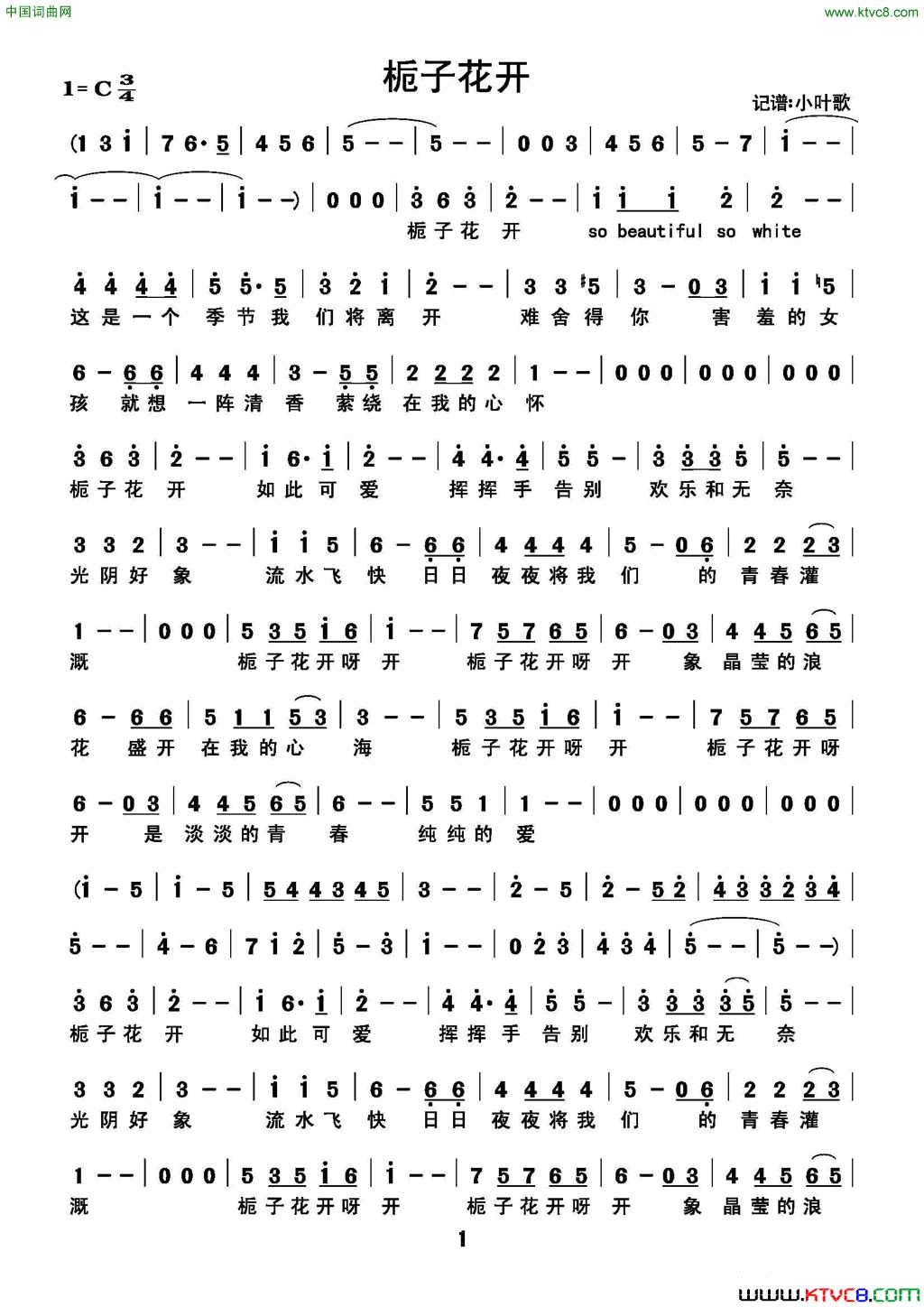 栀子花开简谱,演唱何炅,歌词