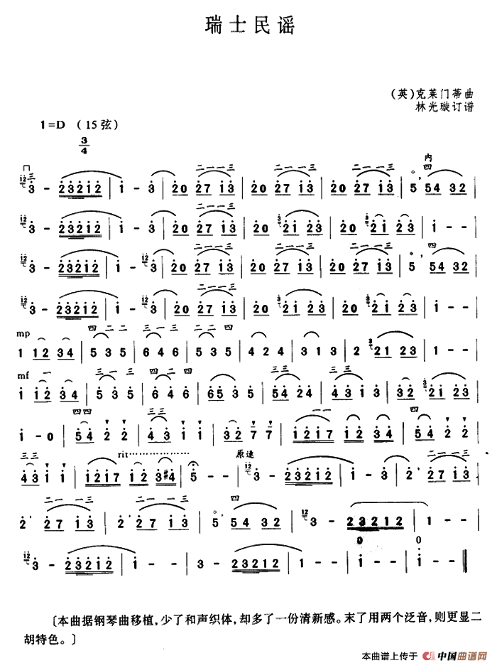 瑞士民谣胡琴谱,瑞士民谣简谱"