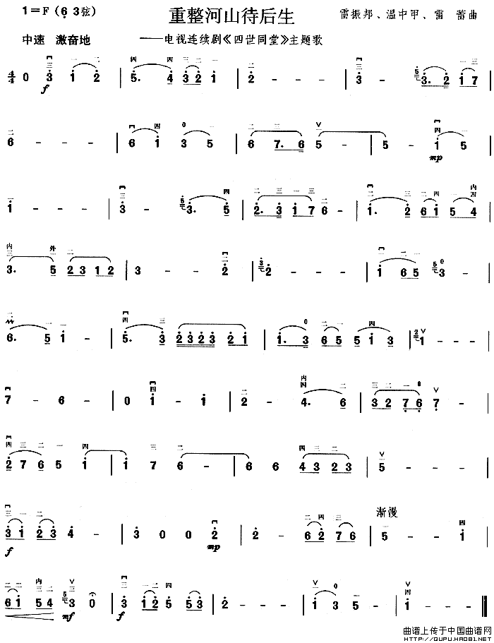 重整河山待后生胡琴谱(电视剧《四世同堂》主题曲),重整河山待后生简谱"