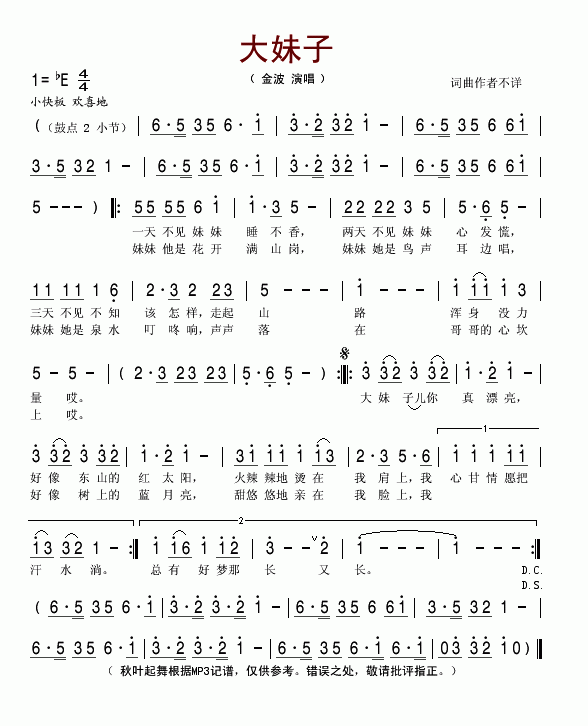 大妹子简谱,大妹子歌曲简介