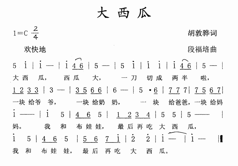 大西瓜歌曲简介大西瓜歌曲的曲调轻快欢快,歌词简单易懂,非常容易让孩子们学唱。歌曲的主旋律是由