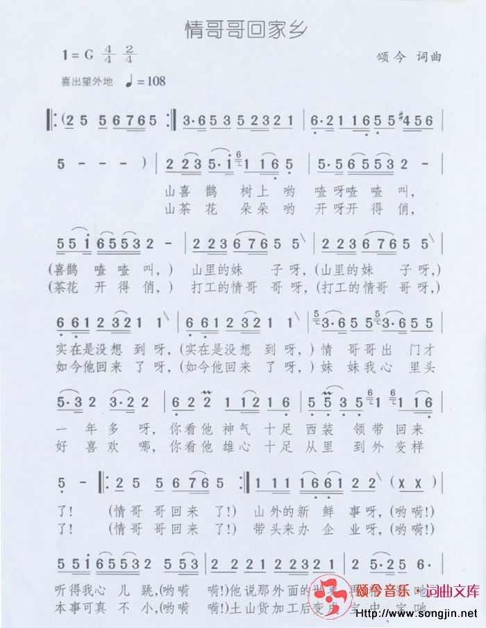 情哥哥回家乡简谱,情哥哥回家乡歌曲简介