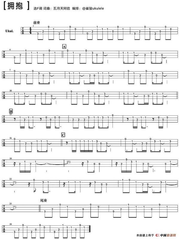 拥抱吉他谱(尤克里里指弹谱),拥抱简谱"