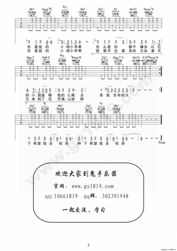小苹果吉他谱(鬼手乐器编配版),小苹果简谱"