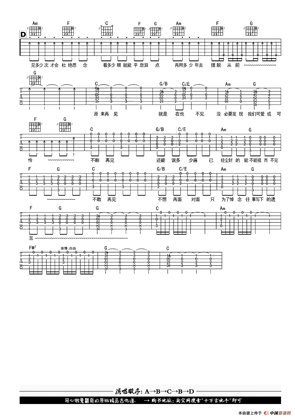 一万次悲伤吉他谱(黑皮吉他屋编配版),一万次悲伤简谱"