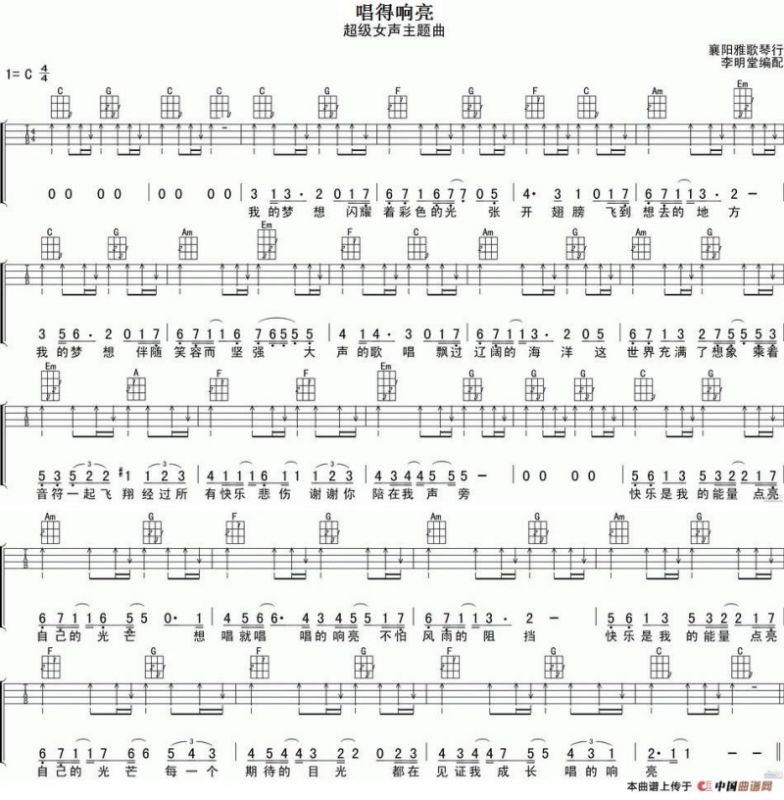 唱得响亮吉他谱(尤克里里弹唱谱、《超级女声》主题曲),唱得响亮简谱"