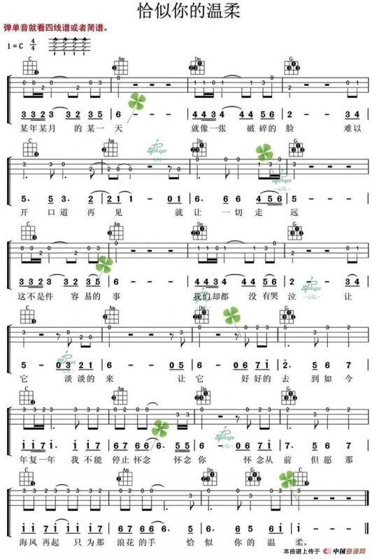 恰似你的温柔吉他谱(尤克里里弹唱谱),恰似你的温柔简谱"