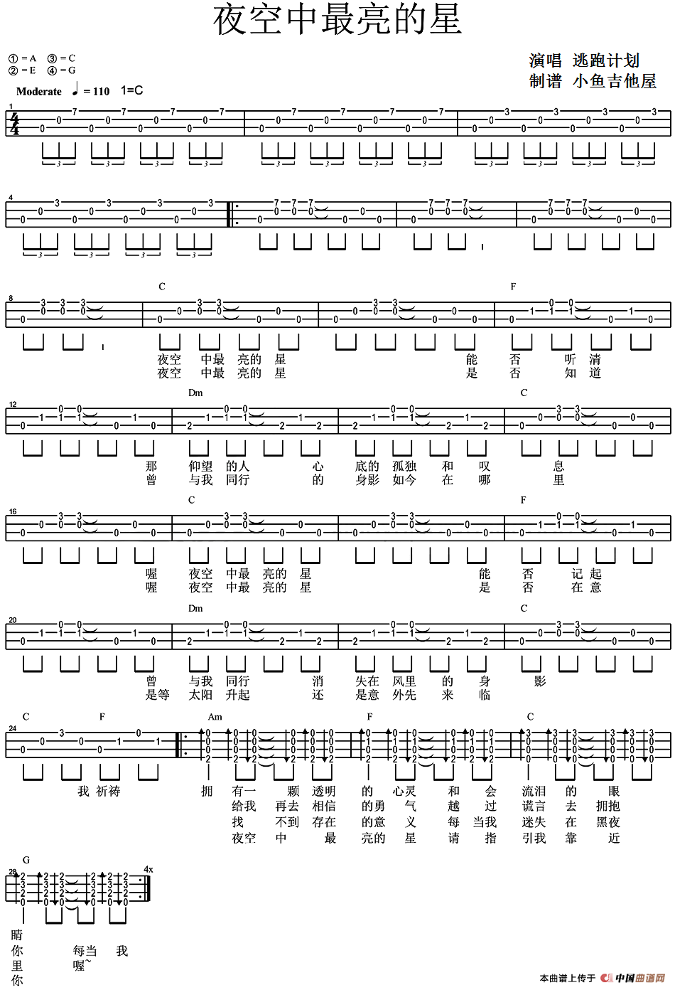 夜空中最亮的星吉他谱(尤克里里弹唱谱),夜空中最亮的星简谱"