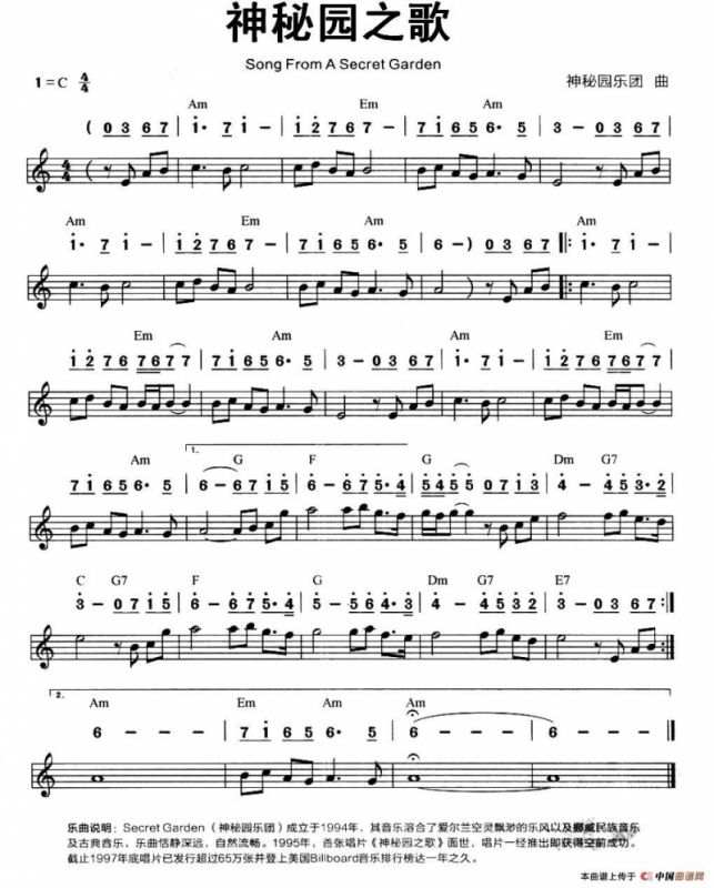 神秘园之歌口琴谱(线简谱混排版),神秘园之歌简谱"