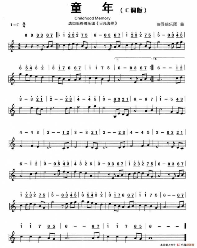 童年口琴谱(选自班得瑞乐团《日光海岸》)(线简谱混排版),童年(选自班得瑞乐团《日光海岸》)简谱"