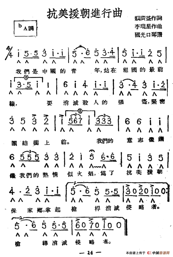 抗美援朝进行曲口琴谱(赖广益词 李瑞星曲、国光口琴编曲版),抗美援朝进行曲简谱"