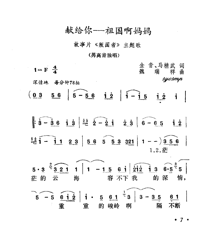 献给你,祖国妈妈简谱,献给你,祖国妈妈歌曲简介"