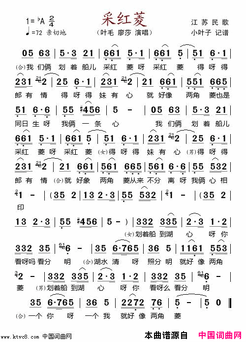 采红菱简谱,演唱叶毛,歌词
