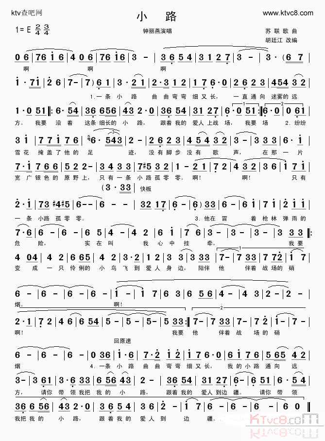 啊 啊 啊 一条小路曲曲弯弯细又长, 一直通向迷雾的远方。 我要沿着这条细长的小路, 跟着我的爱人上战埸。 我要沿着这条细长的小路, 跟着我的爱人上战埸。 纷纷雪花掩盖了他的足迹, 没有脚步, 没有歌声。 在哪一片宽广银色的原野上, 只有一条小路孤零零。 啊 啊 只有一条小路孤零零。 他在冒着枪林弹雨的危险, 实在叫我心中挂牵。 我要变成一只怜悧的小鸟, 飞到爱人身边, 陪伴他伴着战埸的硝烟。 啊 啊 我要变成一只怜悧的小鸟, 飞到爱人身边, 陪伴他伴着战埸的硝烟。 一条小路曲曲弯弯细又长, 一直通向迷雾的远方。 请你带领我吧我的小路, 跟着我的爱人上边疆。 请你带领我吧我的小路, 跟着我的爱人上边疆。版权声明:本站所有文章资源内容,如无特殊说明或标注,均为网络资源。如若本站内容侵犯了原著者的合法权益,可联系本站删除。