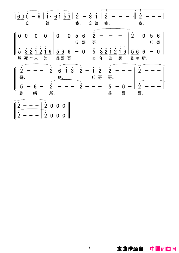 兵哥哥演唱:悠悠想死个人的兵哥哥去年他当兵到哨所夜晚他是我枕上的梦白天他是我嘴里的歌严冬里刮风又下雪呀啊 我真想啊我真想给他给他送去一团火兵哥哥啊兵哥哥妹妹心中的星一颗边关的冷暖托付你家中的事儿交给我边关的冷暖托付你家中的事儿交给我家中的事儿交给我交给我 交给我 交给我天涯有个兵哥哥威威武武呀保祖国奶奶为你笑弯了腰妈妈夸你是个棒小伙最是妹妹心里甜哪啊望着你呀望着你的照片我就那个偷偷乐兵哥哥啊兵哥哥妹妹心中的星一颗边关的冷暖托付你家中的事儿交给我边关的冷暖托付你家中的事儿交给我家中的事儿交给我 交给我 交给我交给我兵哥哥..... 兵哥哥....兵哥哥....版权声明:本站所有文章资源内容,如无特殊说明或标注,均为网络资源。如若本站内容侵犯了原著者的合法权益,可联系本站删除。