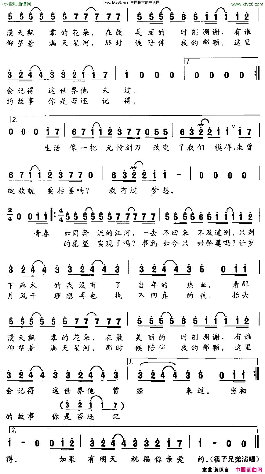 老男孩-筷子兄弟那是我日夜思念深深爱着的人啊到底我该如何表达她会接受我吗也许永远都不会跟她说出那句话注定我要浪迹天涯怎么能有牵挂梦想总是遥不可及是不是应该放弃花开花落又是雨季春天啊你在哪里青春如同奔流的江河一去不回来不及道别只剩下麻木的我没有了当年的热血看到满天飘零的花朵在最美丽的时刻凋谢有谁会记得这世界她来过转眼过去多年时间多少离合悲欢曾经志在四方少年羡慕南飞的雁各自奔前程的身影匆匆渐行渐远未来在哪里平凡啊谁给我答案那时陪伴我的人啊你们如今在何方我曾经爱过的人啊现在是什么模样当初的愿望实现了吗事到如今只好祭奠吗任岁月风干理想再也找不回真的我抬头仰望着满天星河那时候陪伴我的那颗这里的故事你是否还记得生活像一把无情刻刀改变了我们模样未曾绽放就要枯萎吗我有过梦想青春如同奔流的江河一去不回来不及道别只剩下麻木的我没有了当年的热血看那满天飘零的花朵在最美丽的时刻凋谢有谁会记得这世界它曾经来过当初的愿望实现了吗事到如今只好祭奠吗任岁月风干理想再也找不回真的我抬头仰望着满天星河那时候陪伴我的那颗这里的故事你是否还记得如果有明天祝福你亲爱的版权声明:本站所有文章资源内容,如无特殊说明或标注,均为网络资源。如若本站内容侵犯了原著者的合法权益,可联系本站删除。