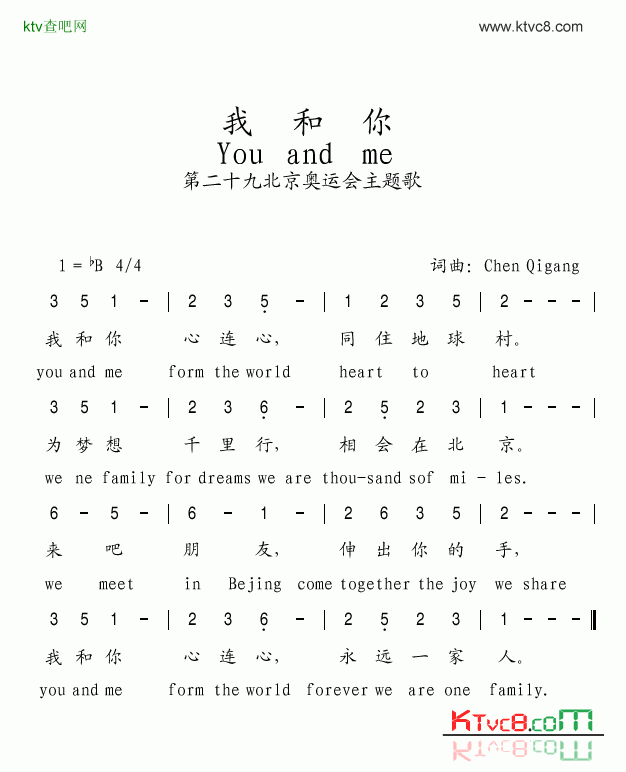 我和你心连心共住地球村为梦想千里行相会在北京来吧朋友伸出你的手我和你心连心永远一家人You and MeFrom one worldWe are familyTravel dreamA thousand milesMeeting in BeijingCome togetherPut you hand in mineYou and MeFrom one worldWe are familyYou and MeFrom one worldWe are familycome togetherA thousand milesMeeting in Beijing我和你(You and Me)心连心(From one world)共住地球村(We are family)为梦想 千里行相会在北京来吧 朋友伸出你的手You and MeFrom one worldWe are family