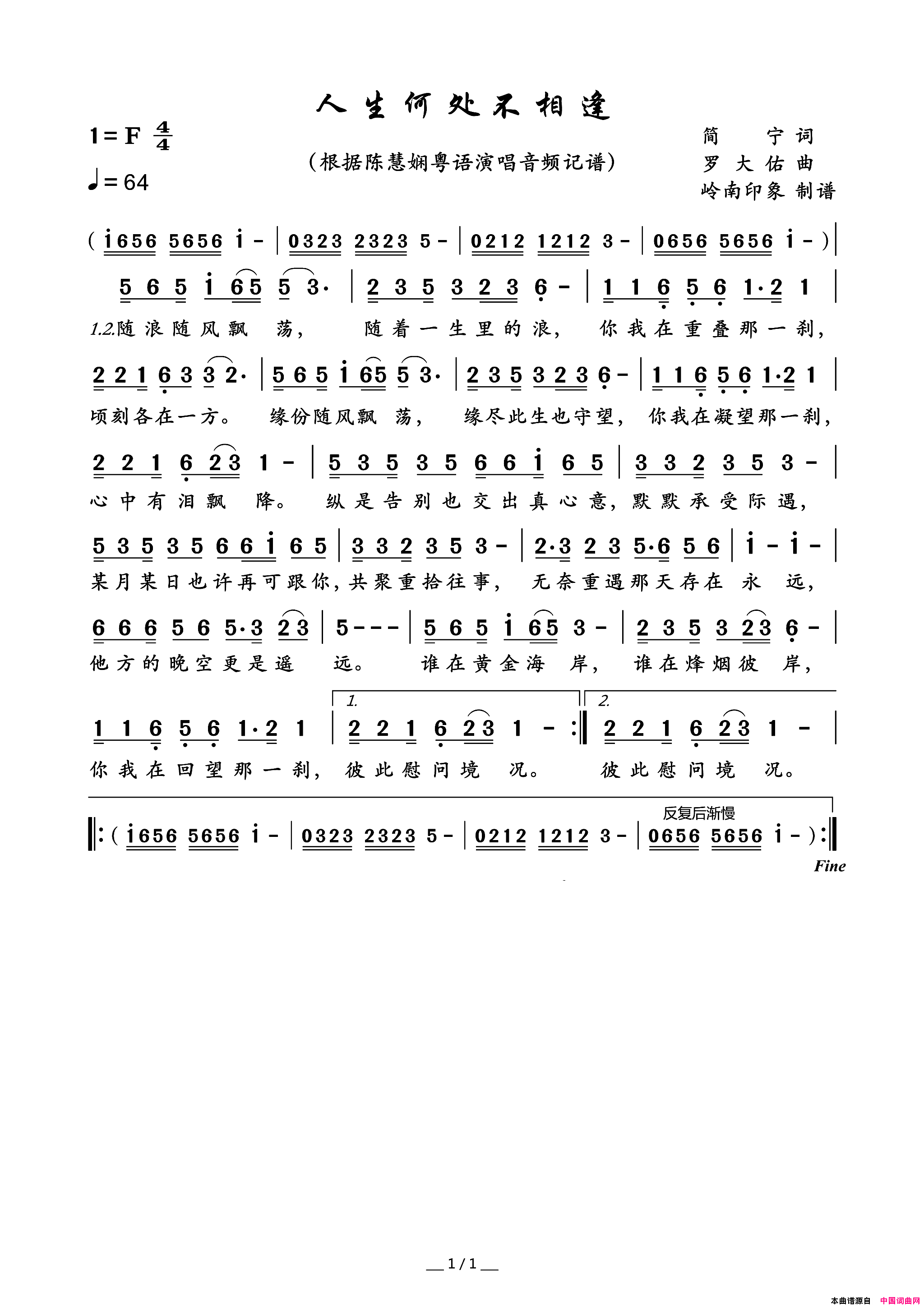 人生何处不相逢简谱,演唱陈慧娴,歌词"