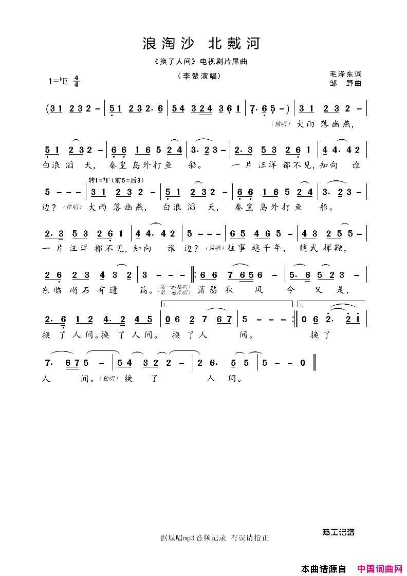 浪淘沙北戴河电视剧《换了人间》电视剧片尾曲简谱,歌词"
