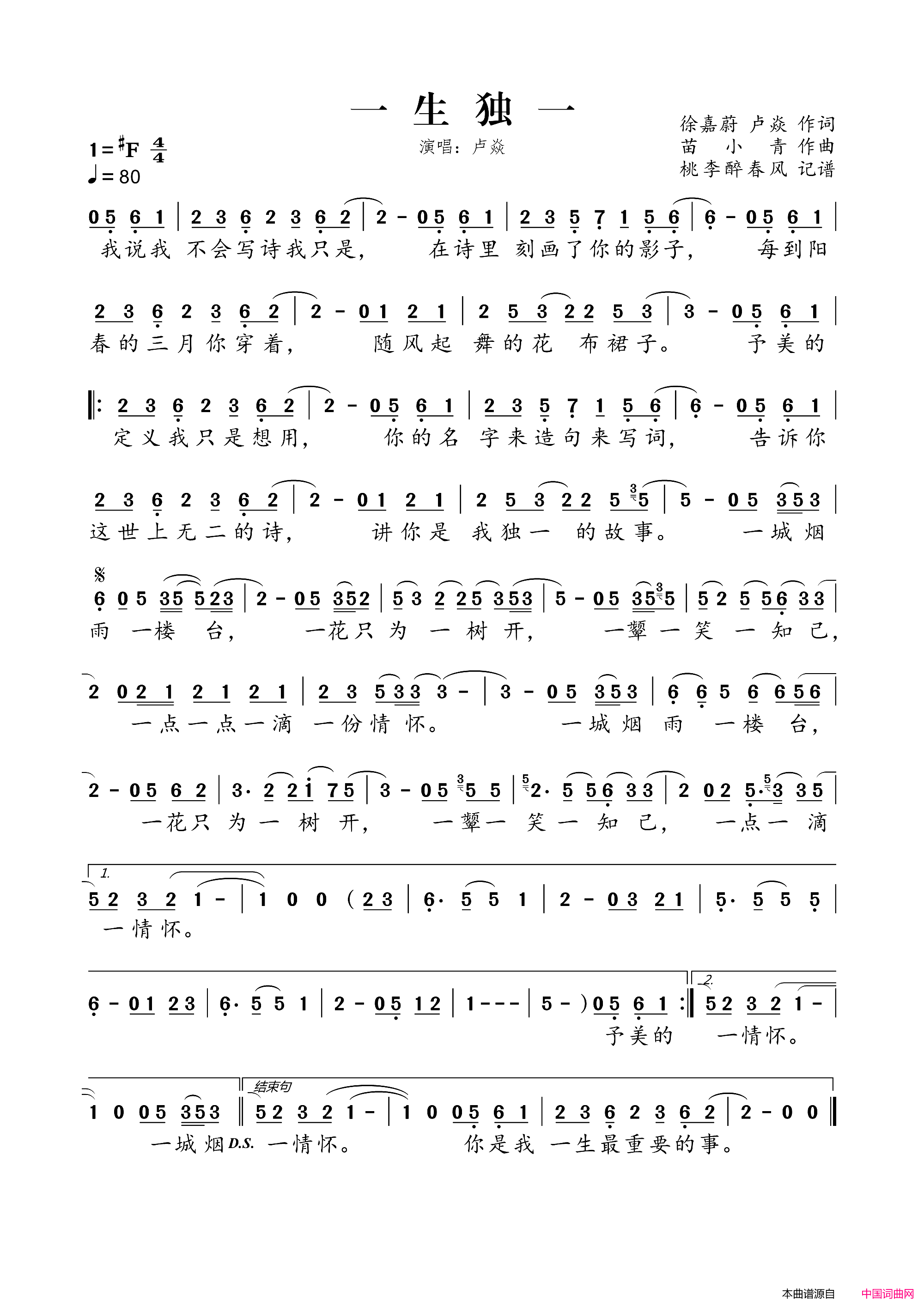 一生独一简谱,歌词"