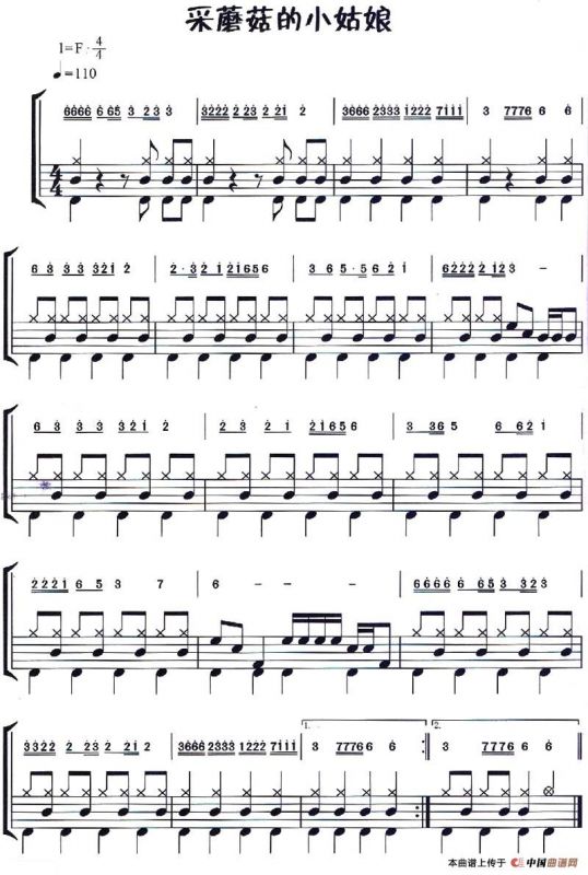 架子鼓谱:应用乐曲集《采蘑菇的小姑娘》,架子鼓谱:应用乐曲集《采蘑菇的小姑娘》简谱"