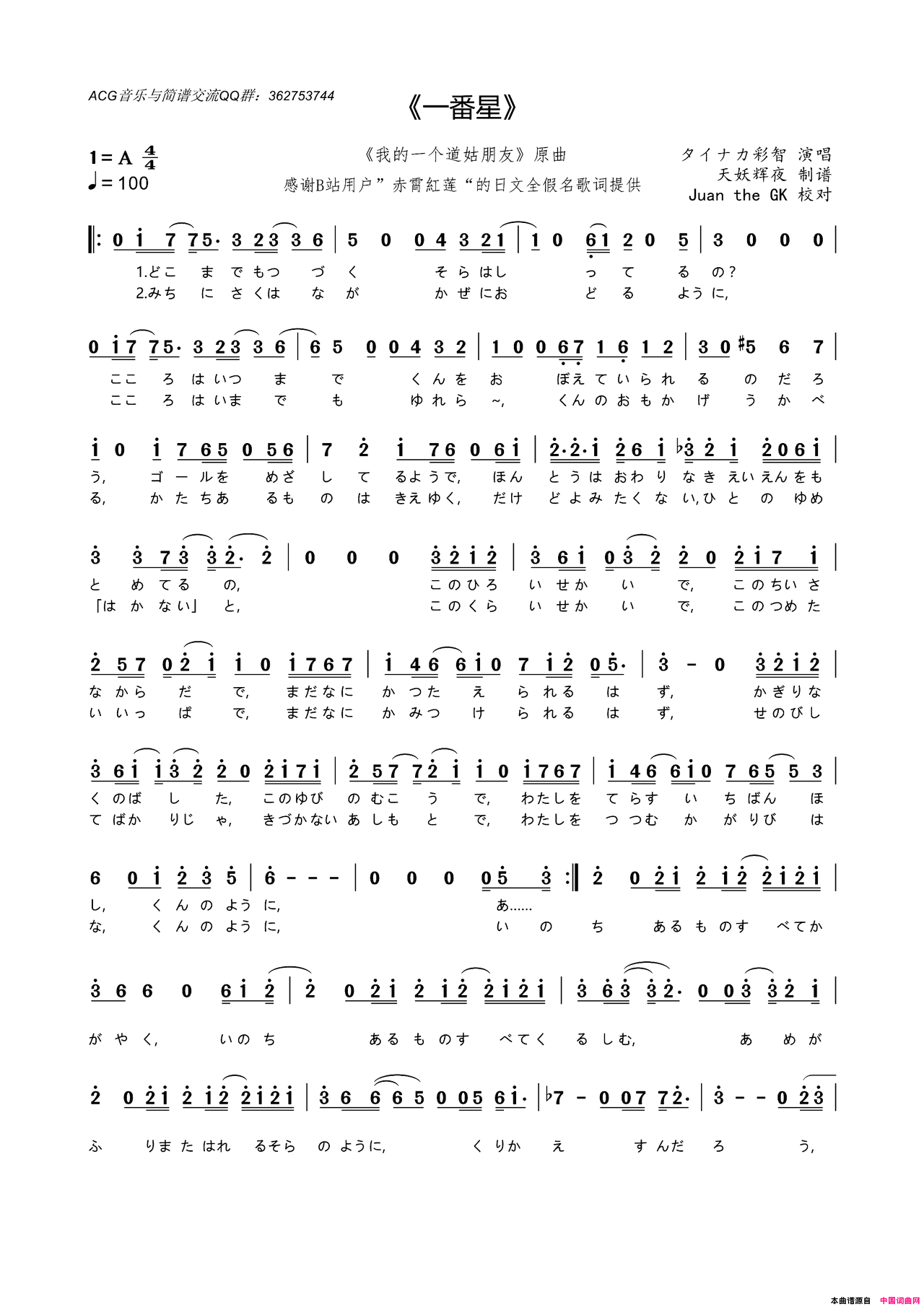 [日]一番星《我的一个道姑朋友》原曲简谱,歌词
