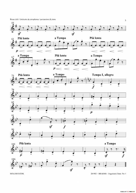 Ungarische Tnze No 5萨克斯谱(十五重奏Basse分谱),Ungarische Tnze No 5萨克斯简谱"