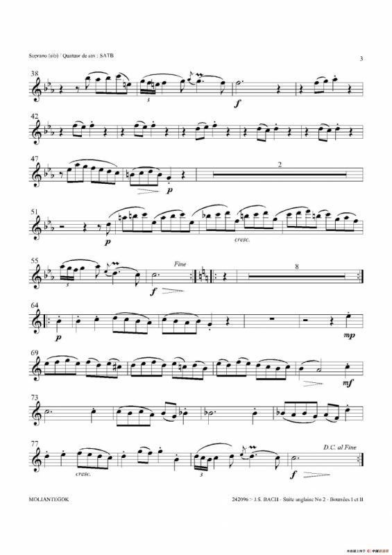 Suite anglaise No 2,BWV 807萨克斯谱(法国组曲之二·布列舞曲)(次中音萨克斯分谱),Suite anglaise No 2,BWV 807(法国组曲之二·布列舞曲)萨克斯简谱"